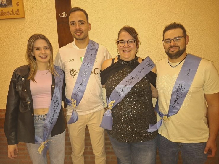 Ein Highlight war wie immer das Krugschlagen: Bei den Junggesellen traf Jeremy Paquet – in seinem letzten Jahr als aktives Mitglied – den entscheidenden Krug und kürte seine Kusine Julie Schumacher zu seiner Krugkönigin. Bei den Verheirateten war es Andy Kohnen, der den Krug vom Fass schoss, und gemeinsam mit seiner Frau Tanja Zeyen den Titel feiern durfte.