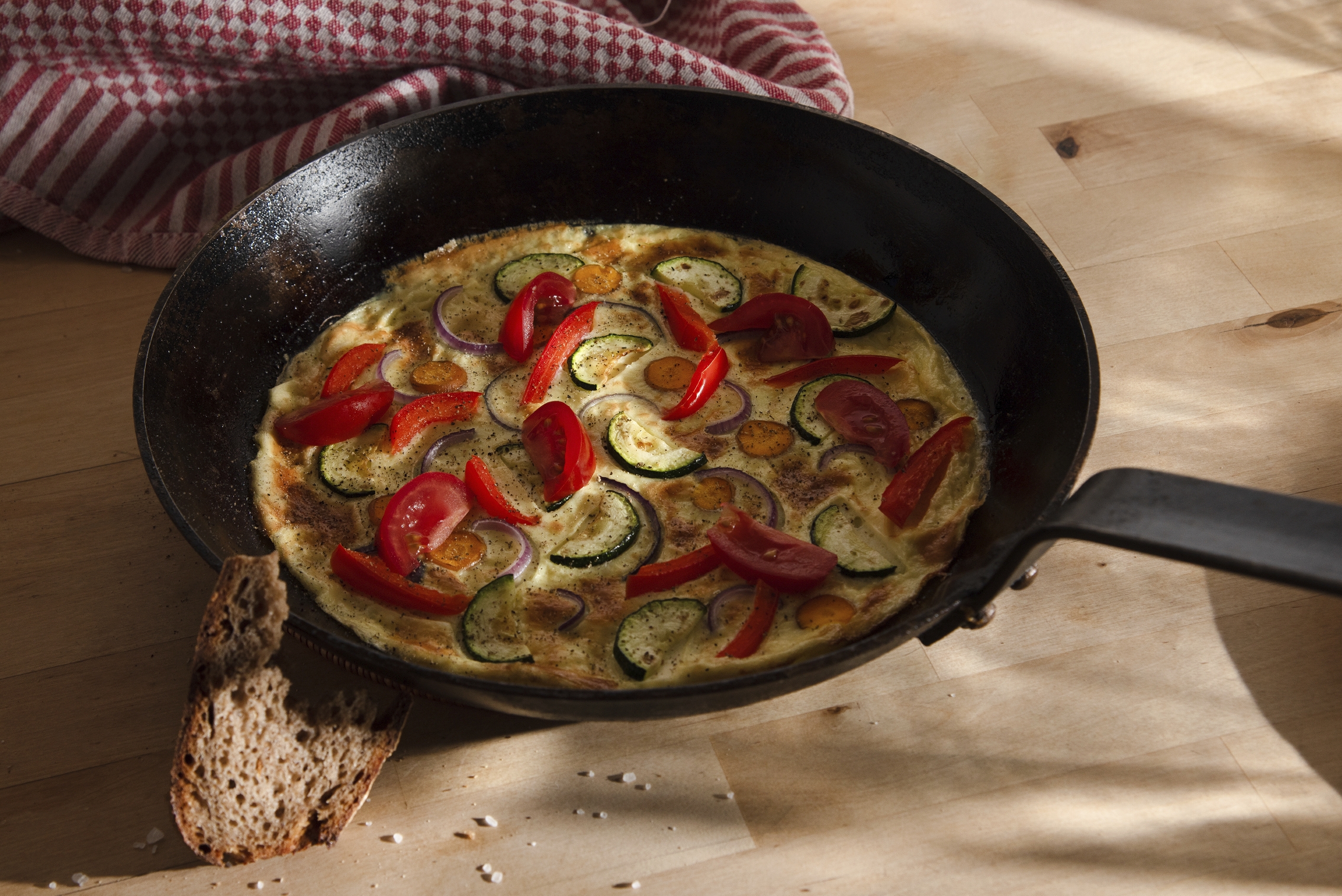 Müsli mit Früchten und Rührei mit Gemüse